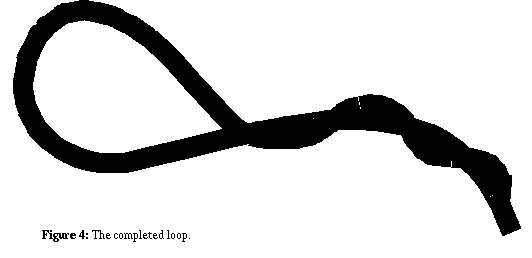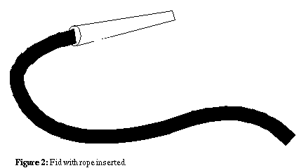 To make a loop in a line, insert the end of the rope into the fid. Next, with the fid in your right hand, pull approximately 12 inches of rope between your right and left hands. Then, take your right hand and push the fid all the way through the rope at something less than it's midpoint. Pull the rope through intil the loop is the size that you want. Then, push the fid all the way through the rope in the opposite direction, and pull it tight. Repeat this process until there it becomes difficult to turn the fid around and continue. At this point, you will have several "stitches" in the rope that will hold the loop. See Figure 3.