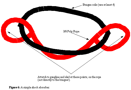 The shock absorber is usually made out of a combination of shock cord and tow line material. Many use this to minimize shock on the wheel dogs as the sled traverses a trail. Some sleds have a shock absorbing device built in (I have three sleds, only one of which has a built-in shock absorber).